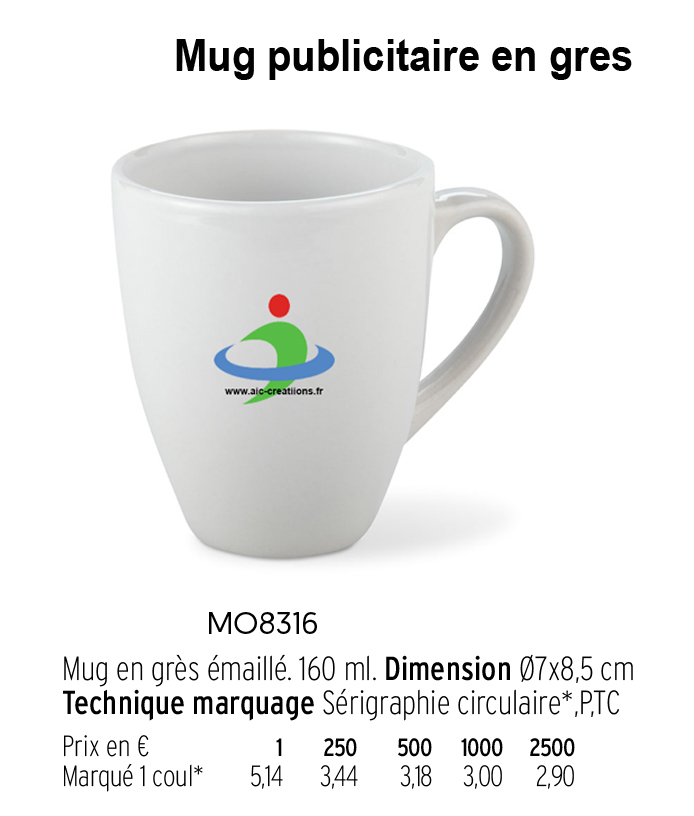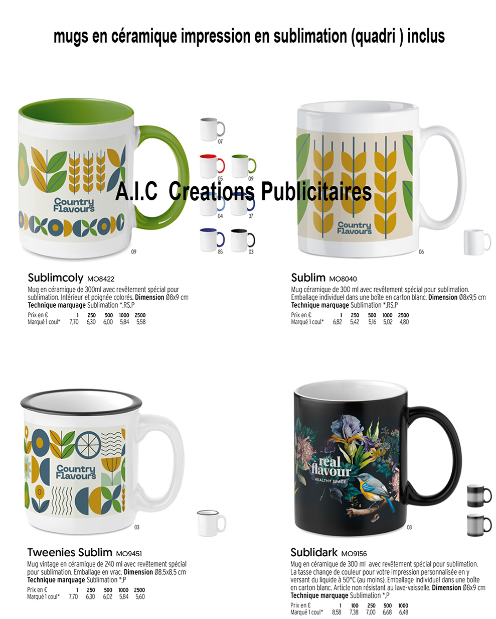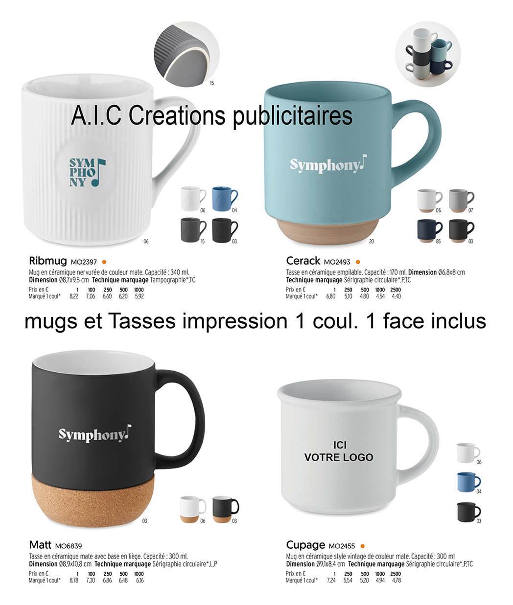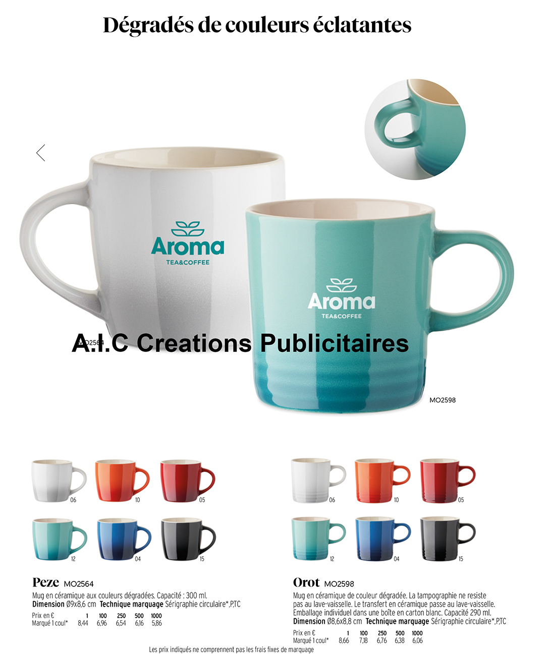 Mugs publicitaires en céramique aux couleurs dégradées - capacité 250 et 300 ml selon le modèle - ACM2564 prix : x 100 pc : 6.96 € - x 250 pc : 6.76 € H.- T marquage 1 couleur inclus
